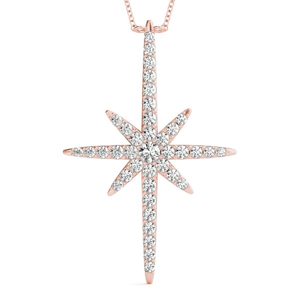 Illuminate your style with our North Star diamond pendant. Each diamond shines brightly against the night sky, guiding you with elegance and grace. Embrace celestial beauty with this timeless symbol of direction and aspiration. This fashion Pendant is suspended by 18 inch cable chain. Available in white gold, rose gold, or platinum. Choose your diamond type and metal preference.