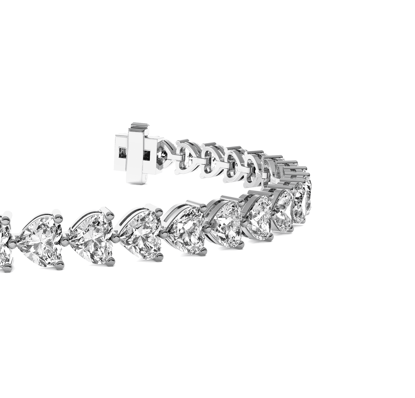 This bracelet features a continuous line of Heart-cut diamonds, each precisely matched for size, color, and clarity. The step-cut facets of the Heart diamonds create a refined hall-of-mirrors effect, offering a sophisticated alternative to traditional brilliant cuts. The diamonds are set in a secure four-prong or bezel-style setting, ensuring both durability and fluid movement along the wrist. Finished with a box clasp and safety latch for added security, this piece highlights timeless elegance with a geometric, modern edge.
