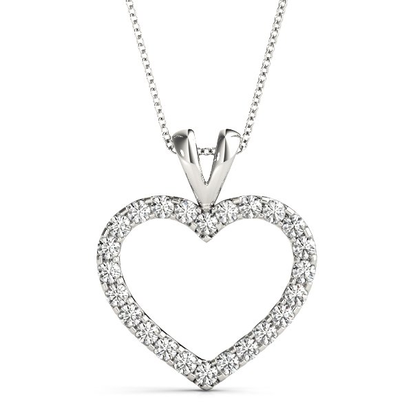 Discover the epitome of refined elegance with our exquisite diamond heart pendant featuring a double V bail. Each brilliant diamond is meticulously nestled within a delicate milgrain setting, forming a captivating heart shape that exudes sophistication and charm. This heart pendant is suspended by 18 inch cable chain. Available in white gold, rose gold, or platinum. Choose your diamond type and metal preference.