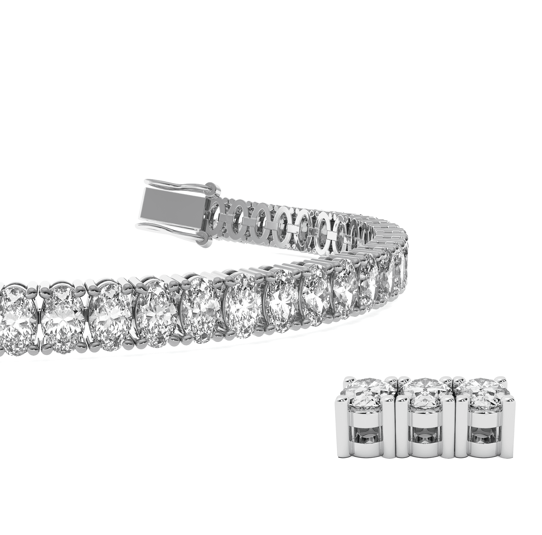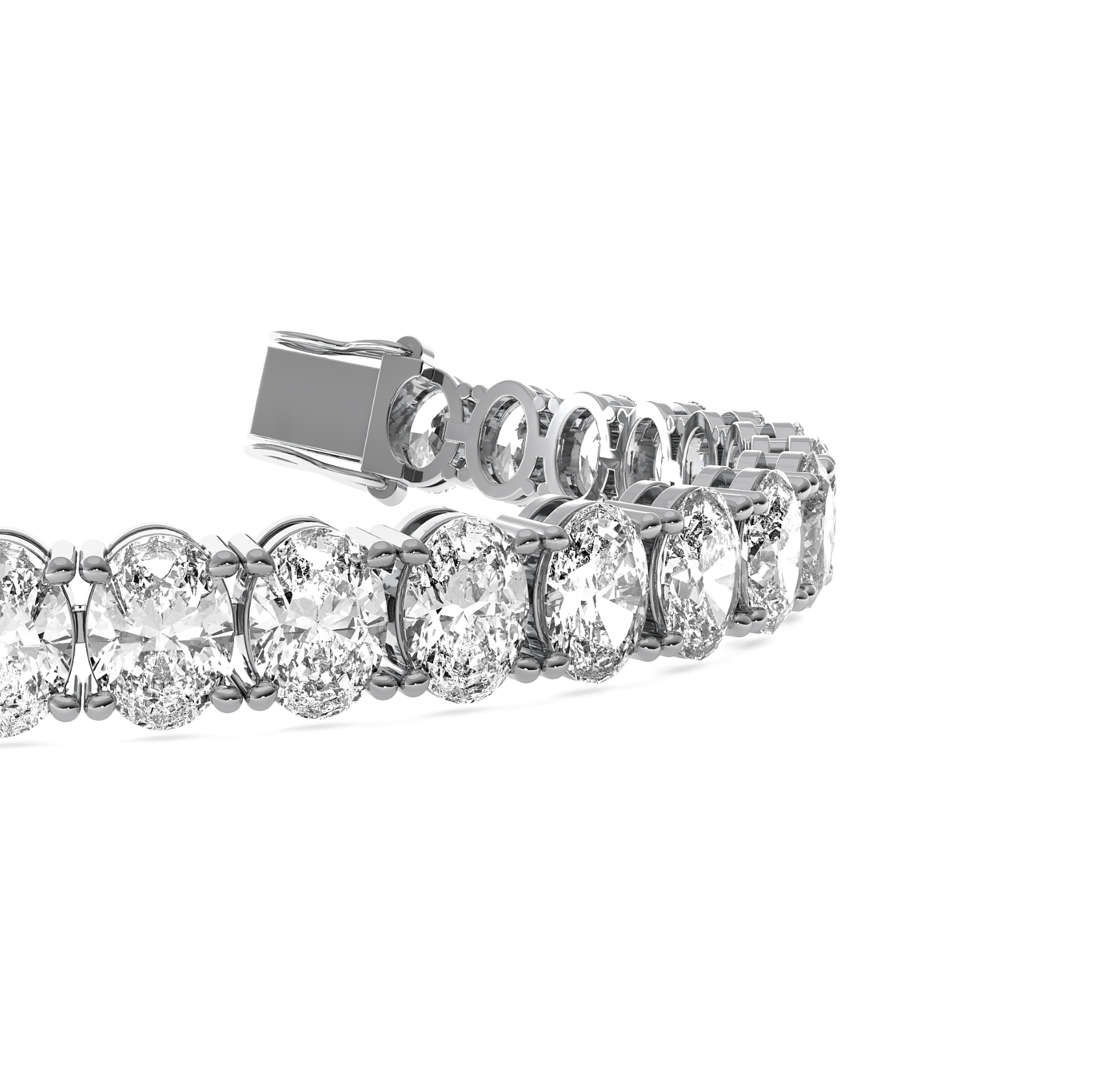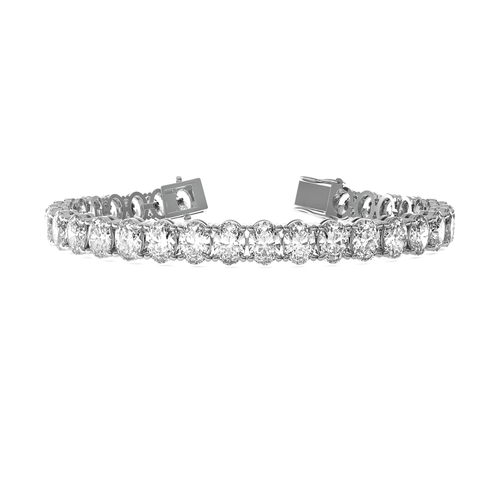 This bracelet features a continuous line of Oval-cut diamonds, each precisely matched for size, color, and clarity. The step-cut facets of the Oval diamonds create a refined hall-of-mirrors effect, offering a sophisticated alternative to traditional brilliant cuts. The diamonds are set in a secure four-prong or bezel-style setting, ensuring both durability and fluid movement along the wrist. Finished with a box clasp and safety latch for added security, this piece highlights timeless elegance with a geometric, modern edge.
