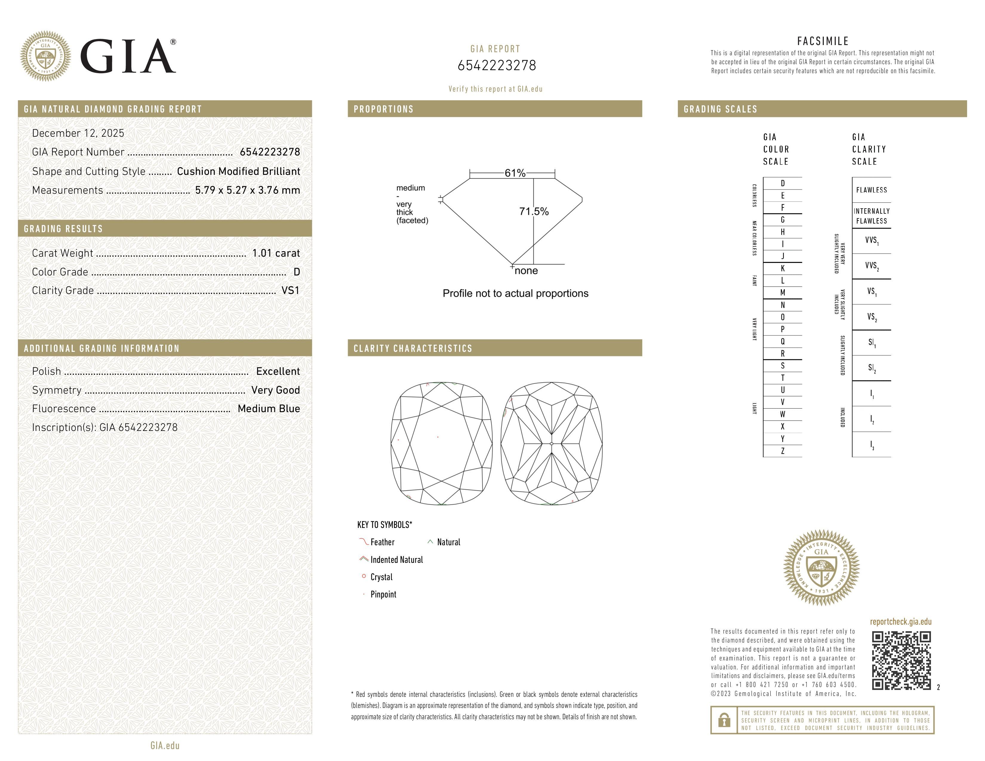 (VS1) This diamond contains very, few inclusions that are difficult for the untrained eye to see under 10x magnification. VS1 diamonds have no visible blemishes and are less expensive than higher clarity grades, therefore offering exceptional value while not compromising on quality.