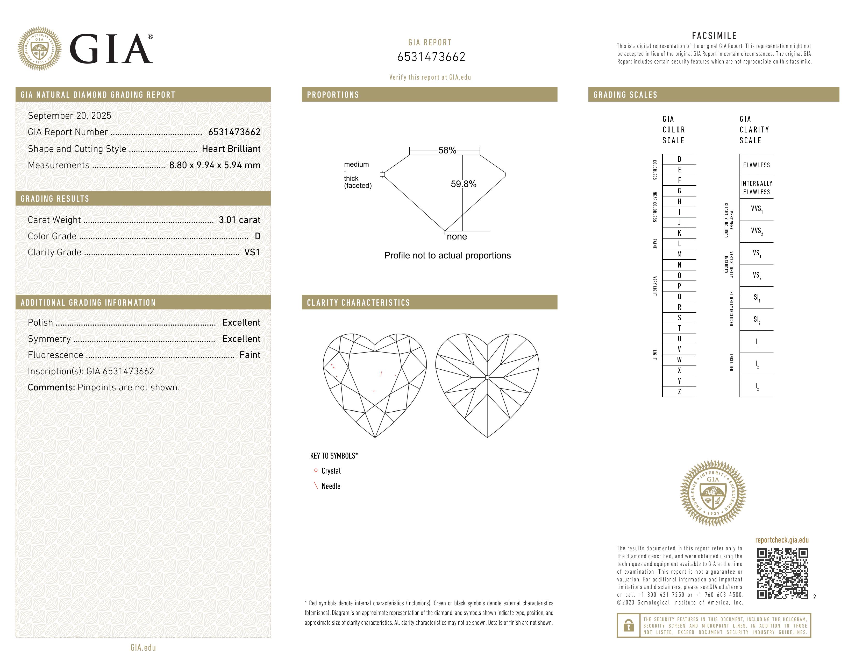 (VS1) This diamond contains very, few inclusions that are difficult for the untrained eye to see under 10x magnification. VS1 diamonds have no visible blemishes and are less expensive than higher clarity grades, therefore offering exceptional value while not compromising on quality.