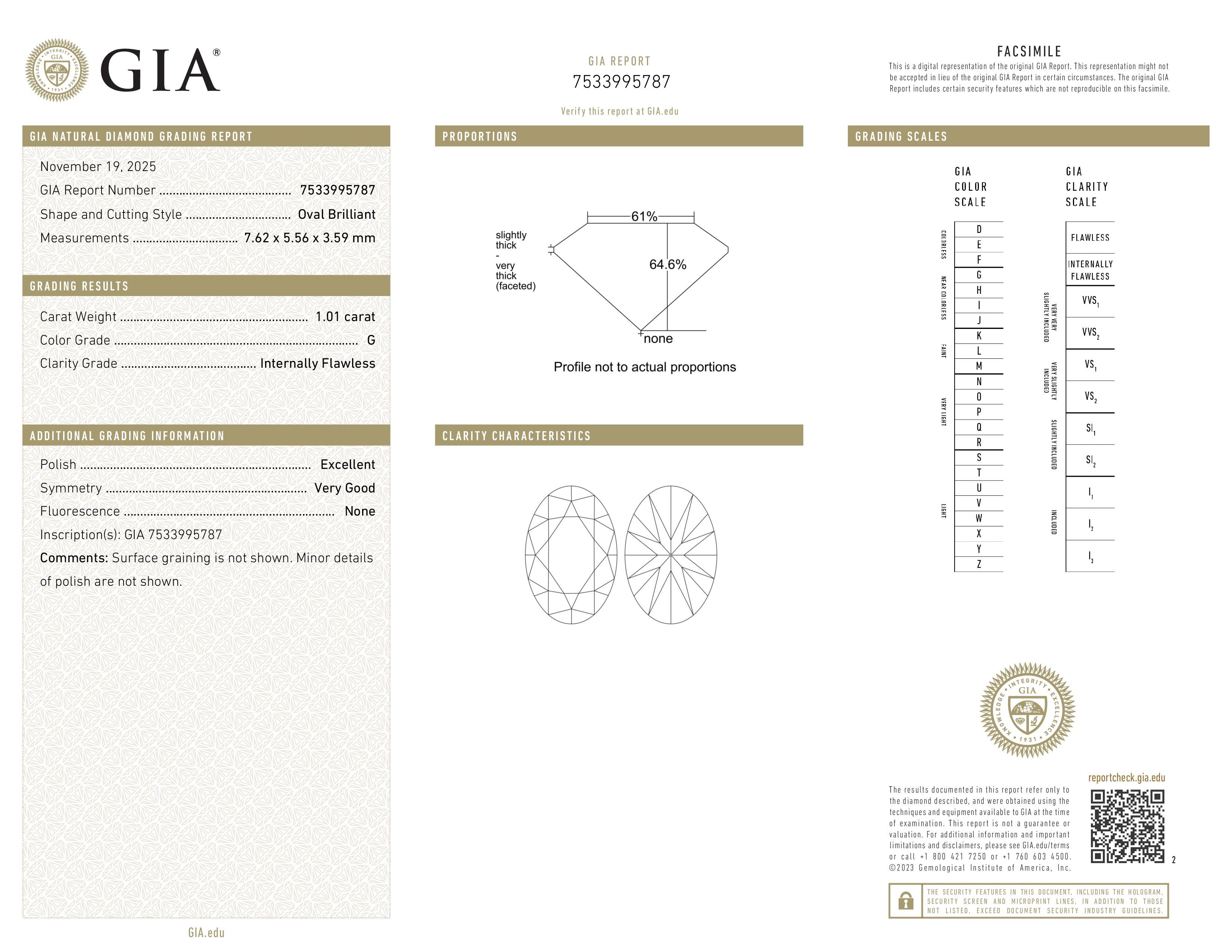 (IF) This diamond contains no internal inclusions when examined by a skilled grader even under high microscopic magnification. The only difference between this diamond and a flawless diamond are extremely minor markings or blemishes on the surface when viewed under 30X magnification. IF is considered top-quality and extremely rare.