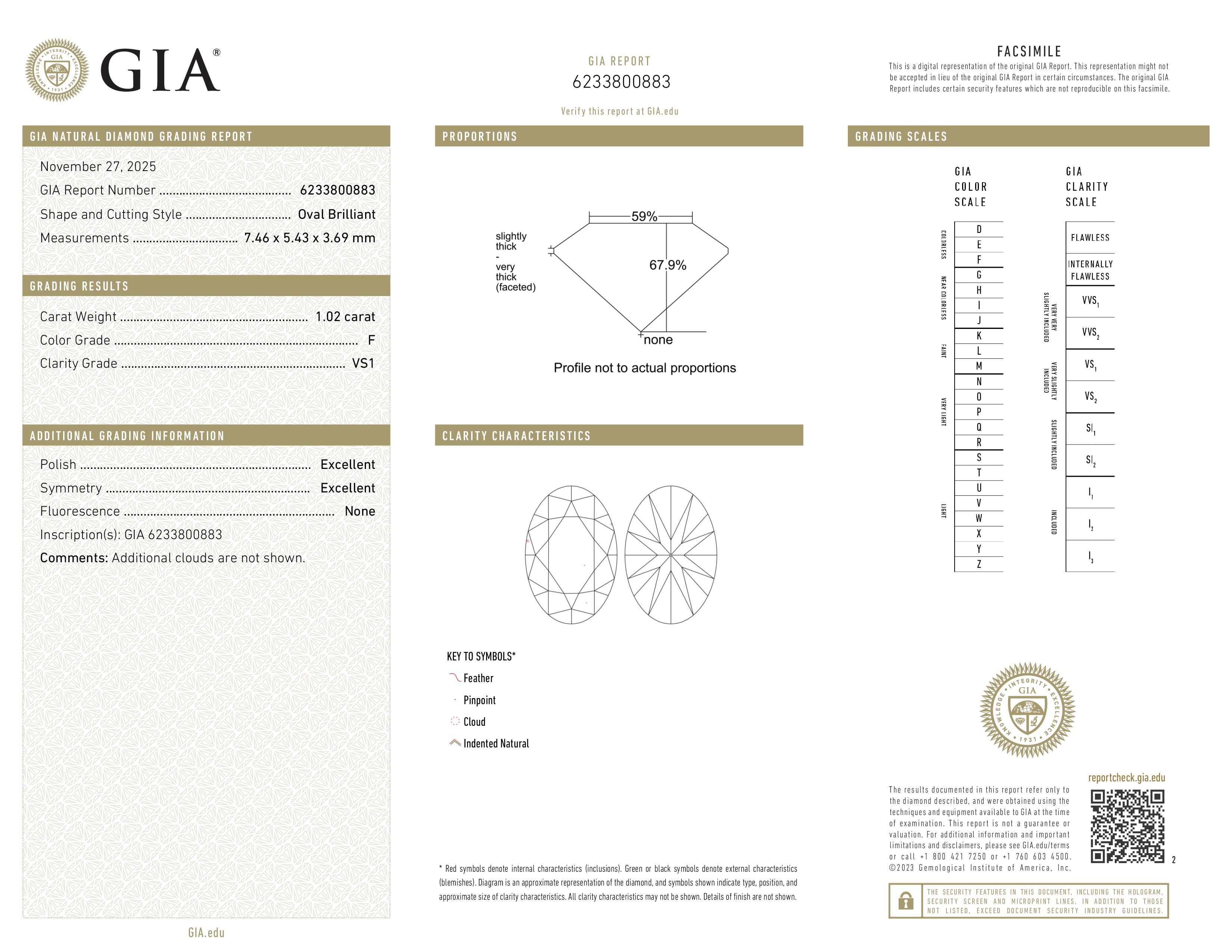 (VS1) This diamond contains very, few inclusions that are difficult for the untrained eye to see under 10x magnification. VS1 diamonds have no visible blemishes and are less expensive than higher clarity grades, therefore offering exceptional value while not compromising on quality.