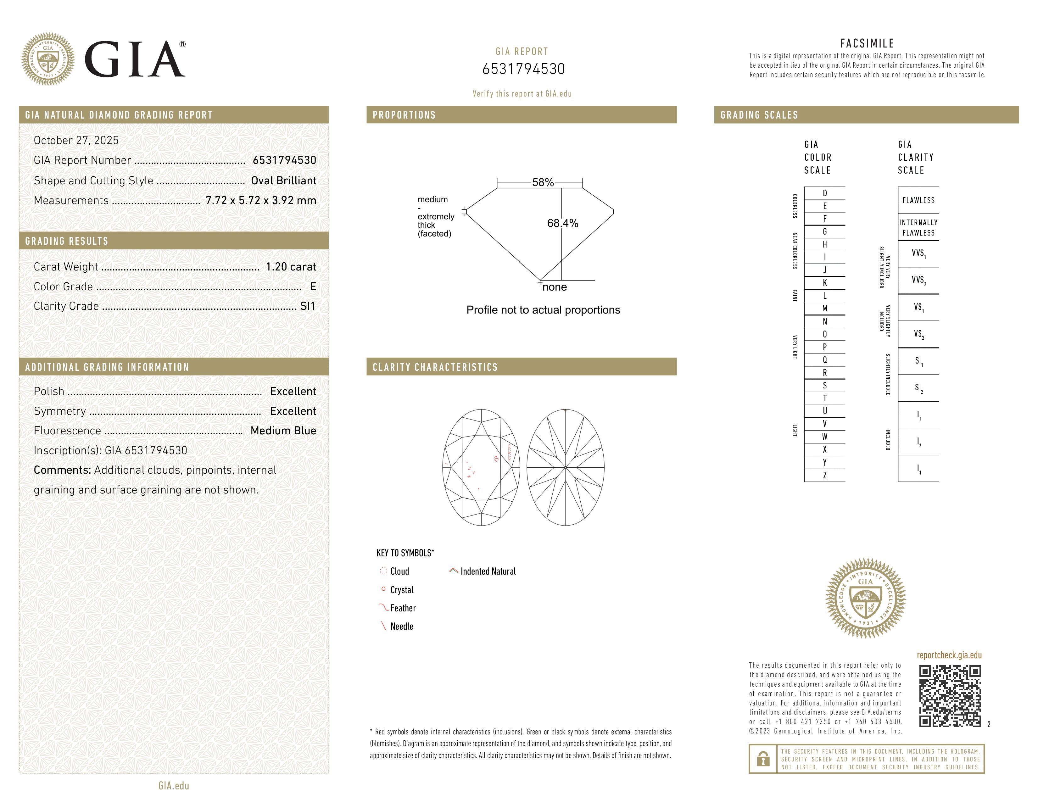 (SI1) This diamond contains few inclusions detectable using 10x magnification. However, when the diamond is set in jewelry, these inclusions are not usually visible to the naked eye. The SI1 graded diamonds are less expensive then higher clarity graded and therefore offer exceptional value for those that want to stay within budget and get a larger diamond. If you're unsure and want our opinion, just let us know and one of our gemologists will review it for you.