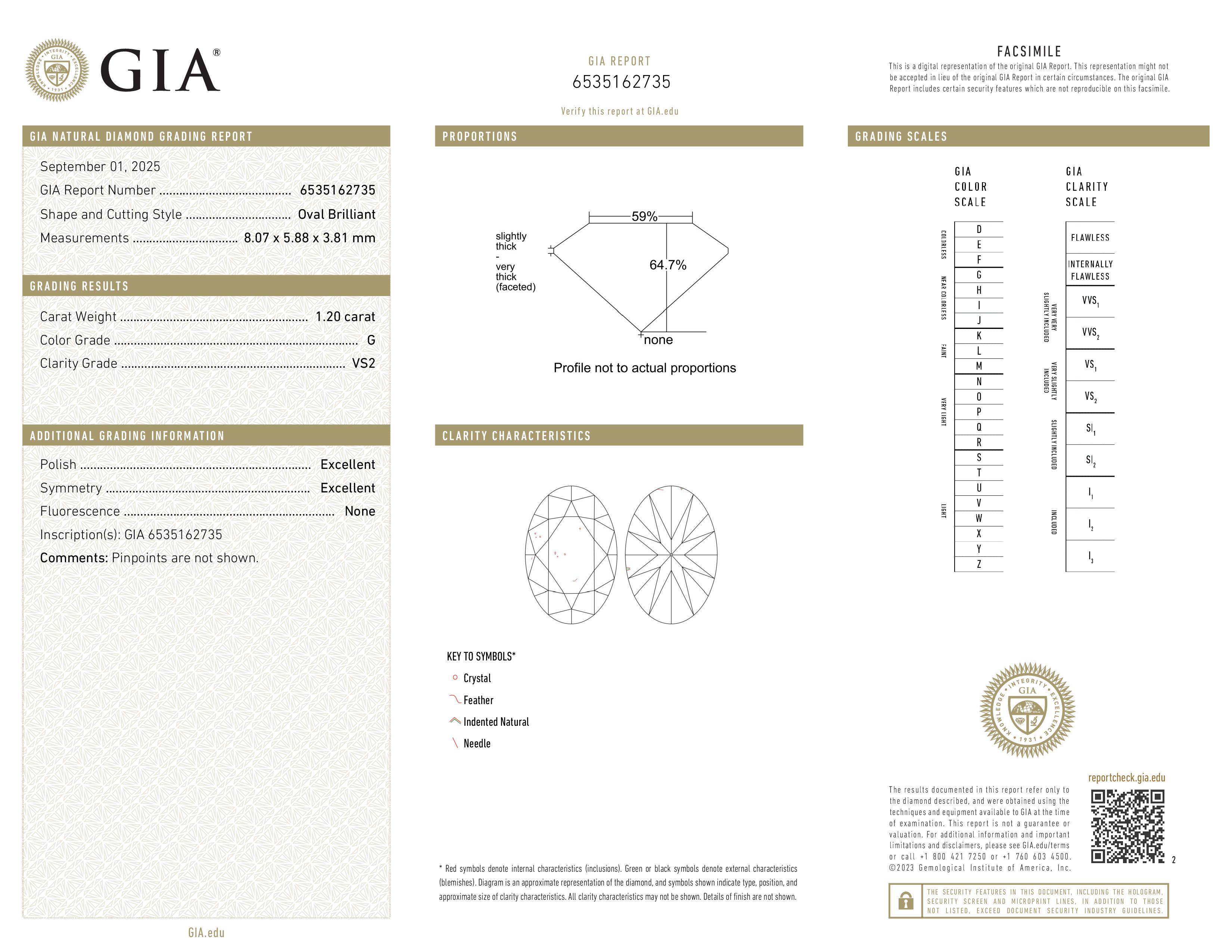 (G) This diamond lies at the top of the "Near-Colorless" family, and appears colorless to the eye when mounted. When examined loose, this diamond has an extremely faint tint of color that can only be detectable by trained gemologists comparing it side-by-side to higher color grades. G-color is considered top-quality and an outstanding value for customers who want to stay within budget and not compromise on color.