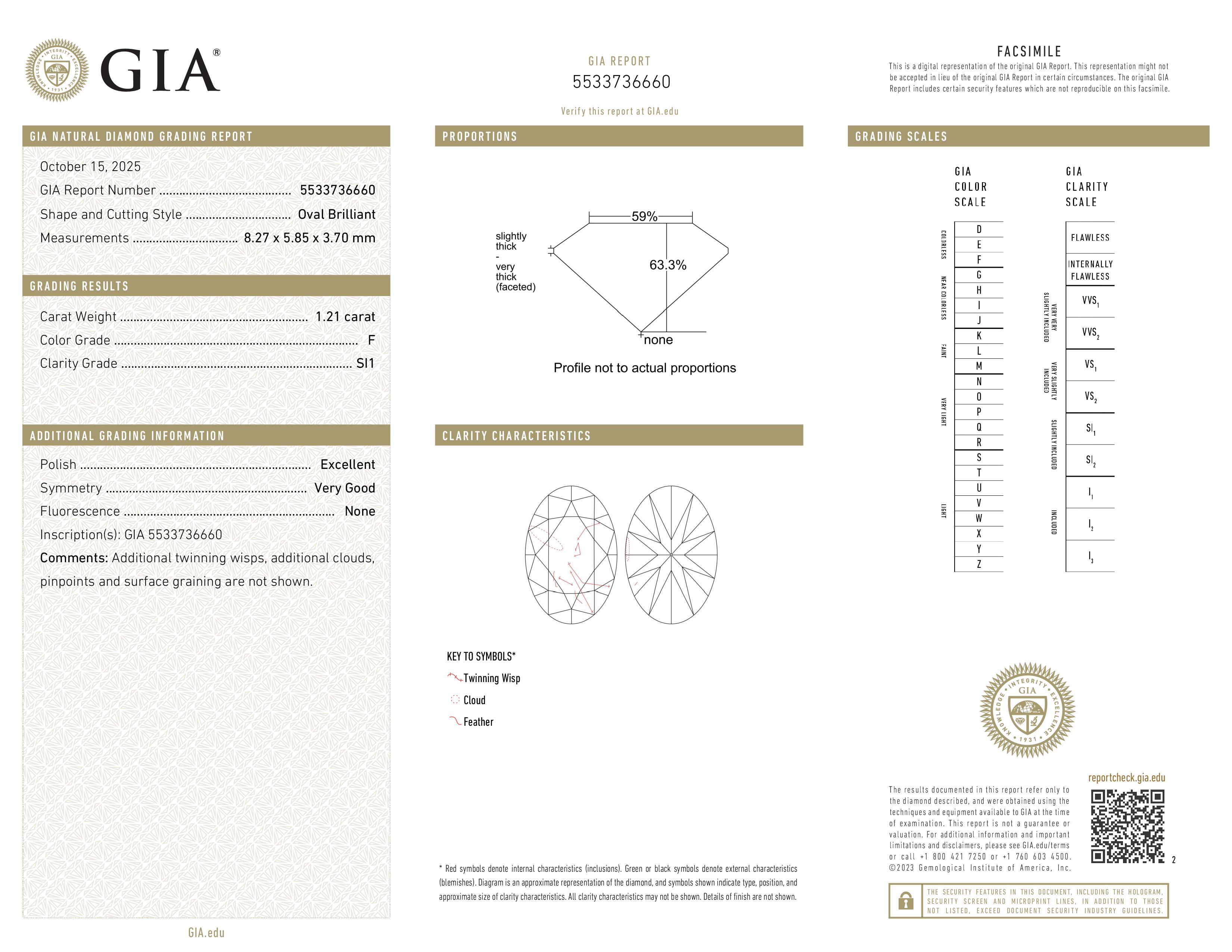 (SI1) This diamond contains few inclusions detectable using 10x magnification. However, when the diamond is set in jewelry, these inclusions are not usually visible to the naked eye. The SI1 graded diamonds are less expensive then higher clarity graded and therefore offer exceptional value for those that want to stay within budget and get a larger diamond. If you're unsure and want our opinion, just let us know and one of our gemologists will review it for you.