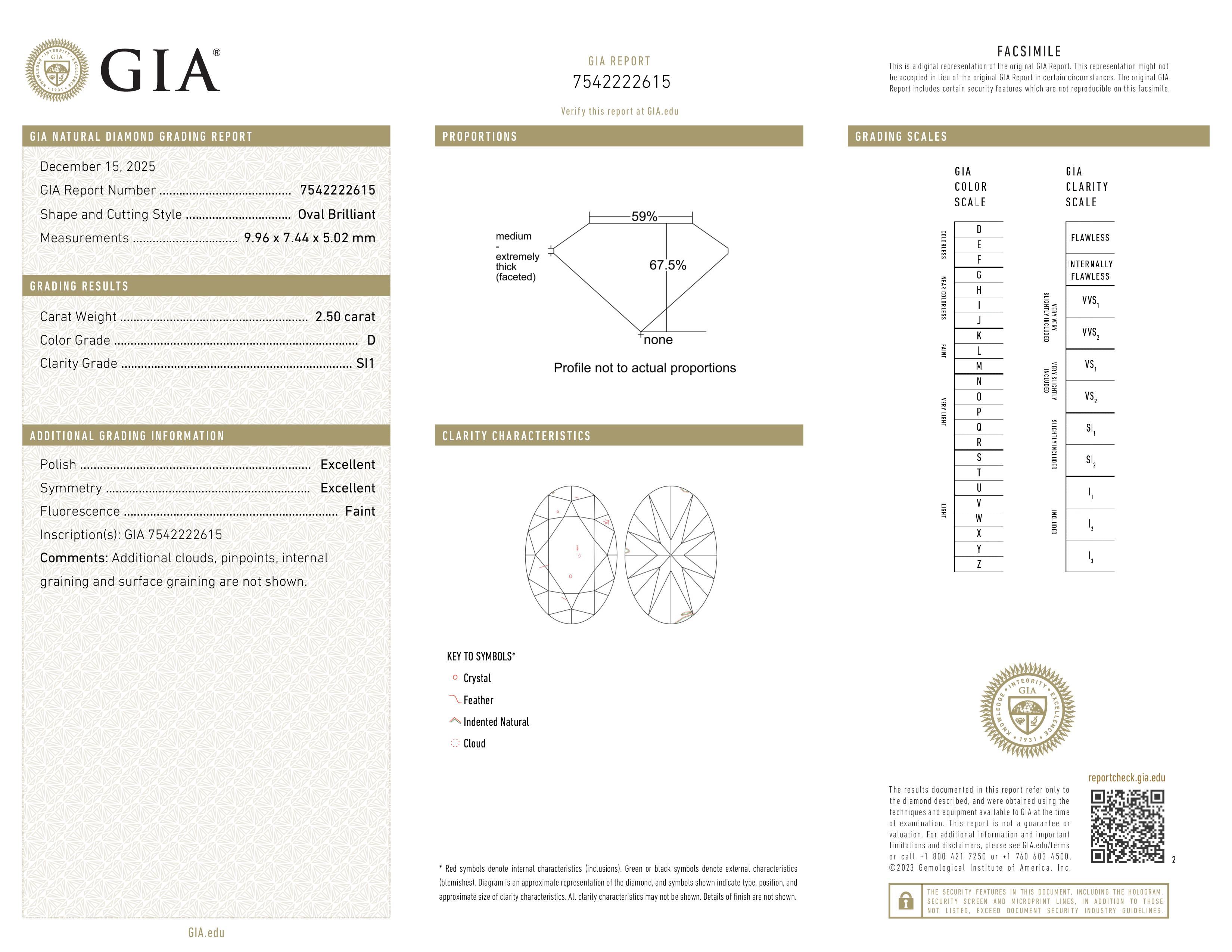 (SI1) This diamond contains few inclusions detectable using 10x magnification. However, when the diamond is set in jewelry, these inclusions are not usually visible to the naked eye. The SI1 graded diamonds are less expensive then higher clarity graded and therefore offer exceptional value for those that want to stay within budget and get a larger diamond. If you're unsure and want our opinion, just let us know and one of our gemologists will review it for you.