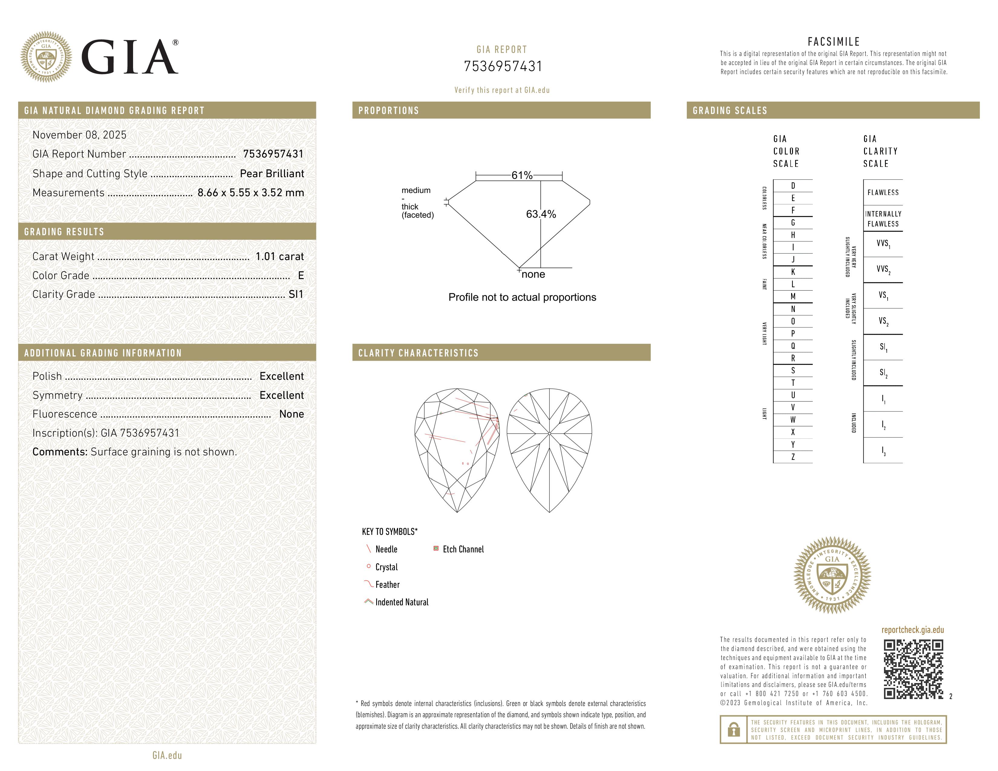 (SI1) This diamond contains few inclusions detectable using 10x magnification. However, when the diamond is set in jewelry, these inclusions are not usually visible to the naked eye. The SI1 graded diamonds are less expensive then higher clarity graded and therefore offer exceptional value for those that want to stay within budget and get a larger diamond. If you're unsure and want our opinion, just let us know and one of our gemologists will review it for you.