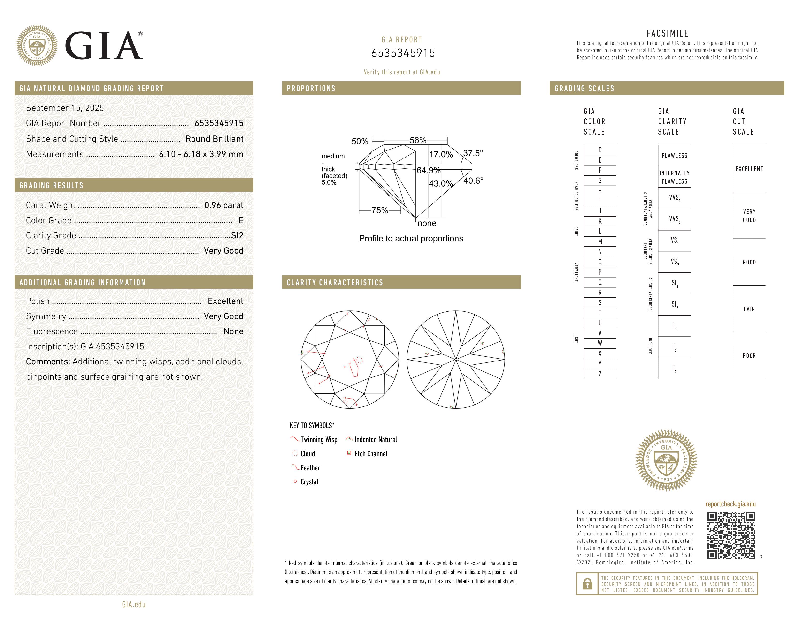(SI2) Some inclusions are detectable under 10x magnification, even to the untrained eye. However, when the diamond is set in jewelry, these inclusions are not usually visible to the naked eye. The SI2 graded diamonds are less expensive then higher clarity graded and therefore offer exceptional value for those that want to stay within budget and get a larger diamond. If you're unsure and want our opinion, just let us know and one of our gemologists will review it for you.