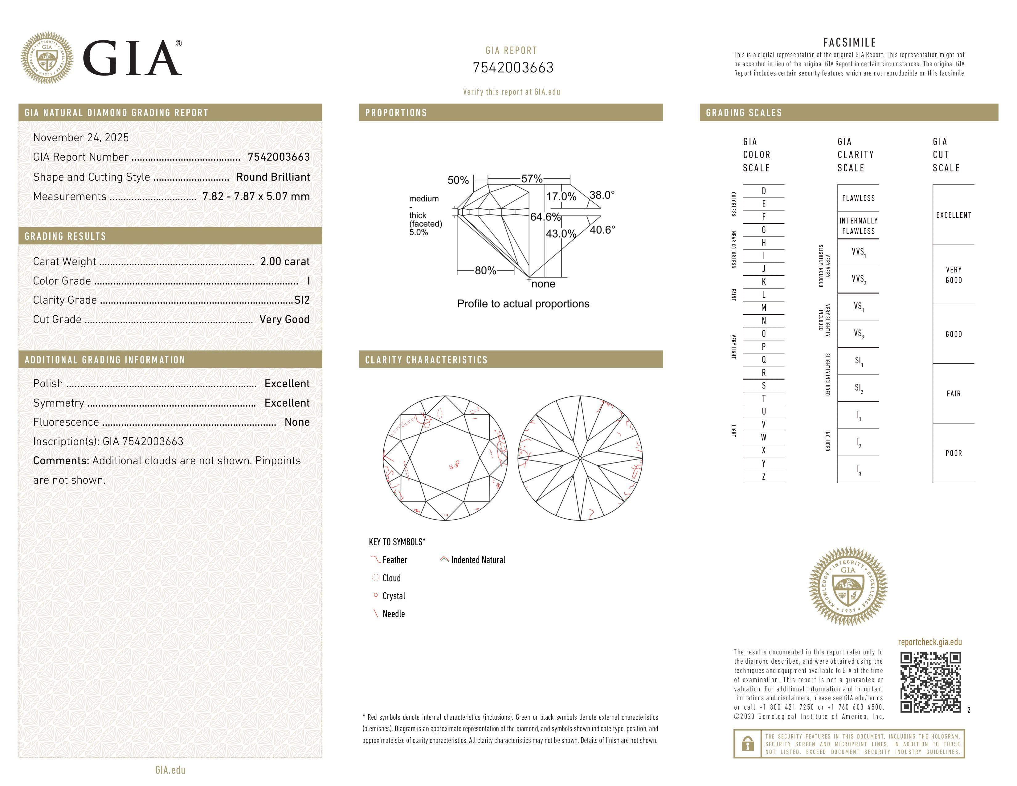 (SI2) Some inclusions are detectable under 10x magnification, even to the untrained eye. However, when the diamond is set in jewelry, these inclusions are not usually visible to the naked eye. The SI2 graded diamonds are less expensive then higher clarity graded and therefore offer exceptional value for those that want to stay within budget and get a larger diamond. If you're unsure and want our opinion, just let us know and one of our gemologists will review it for you.