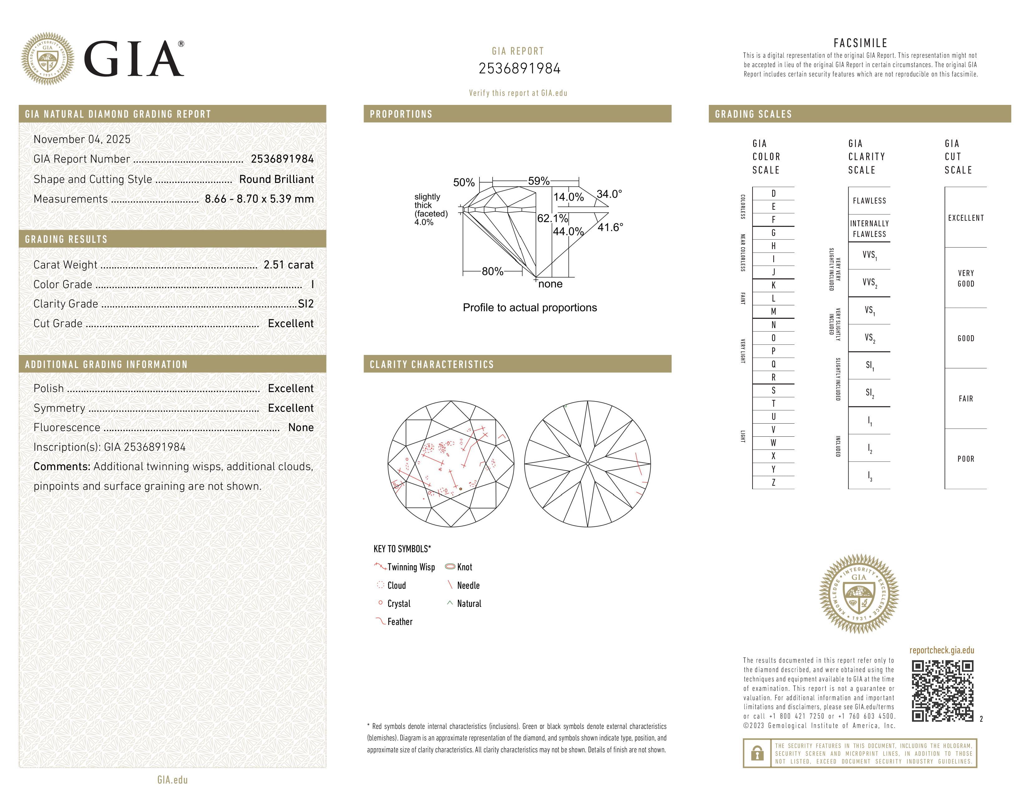 (SI2) Some inclusions are detectable under 10x magnification, even to the untrained eye. However, when the diamond is set in jewelry, these inclusions are not usually visible to the naked eye. The SI2 graded diamonds are less expensive then higher clarity graded and therefore offer exceptional value for those that want to stay within budget and get a larger diamond. If you're unsure and want our opinion, just let us know and one of our gemologists will review it for you.