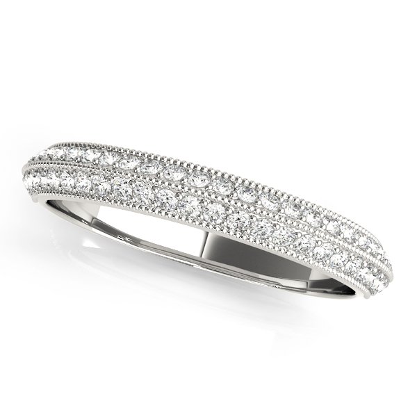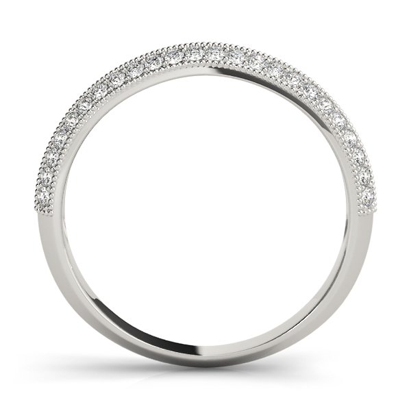 This exquisite wedding band features two rows of diamonds going 1/2 of the way, set in a micro-pave setting, milgrain between the center and outer rows. The shank at the bottom is plain smooth.