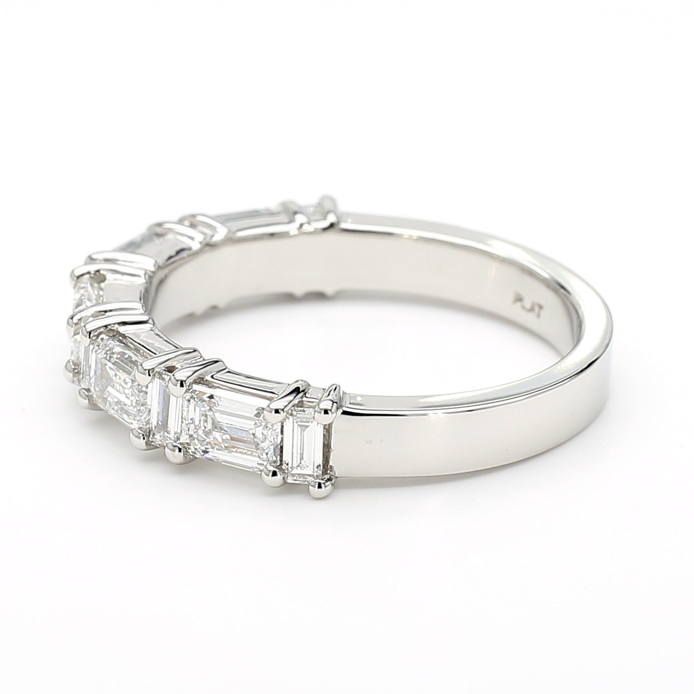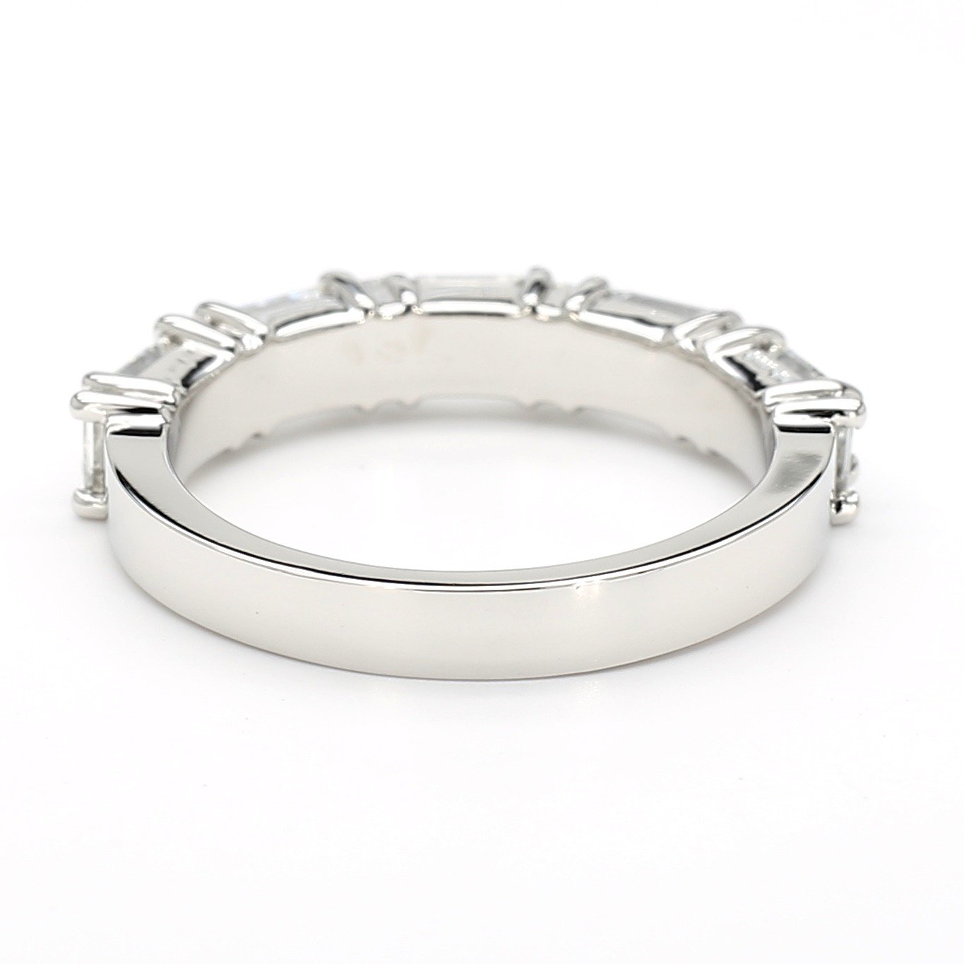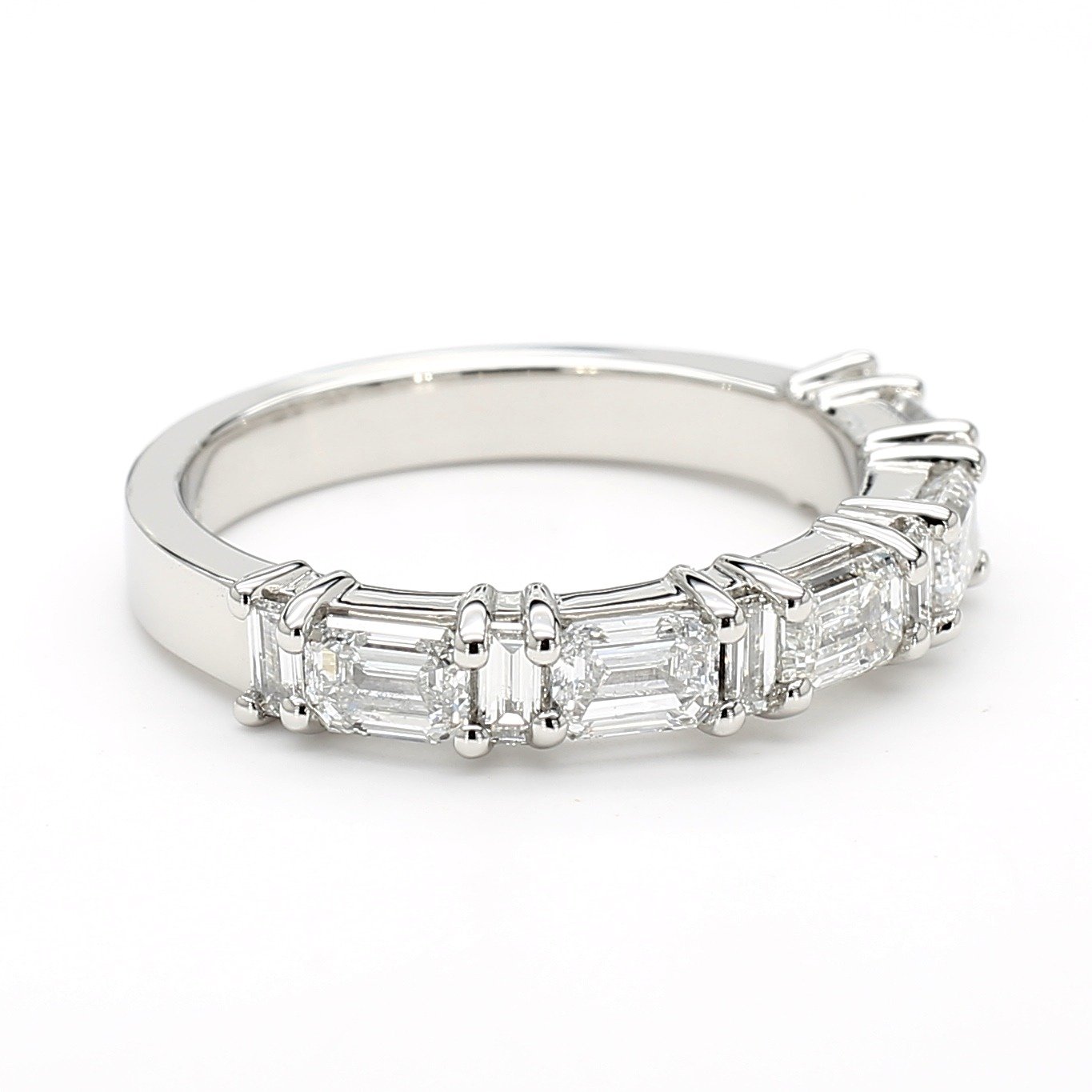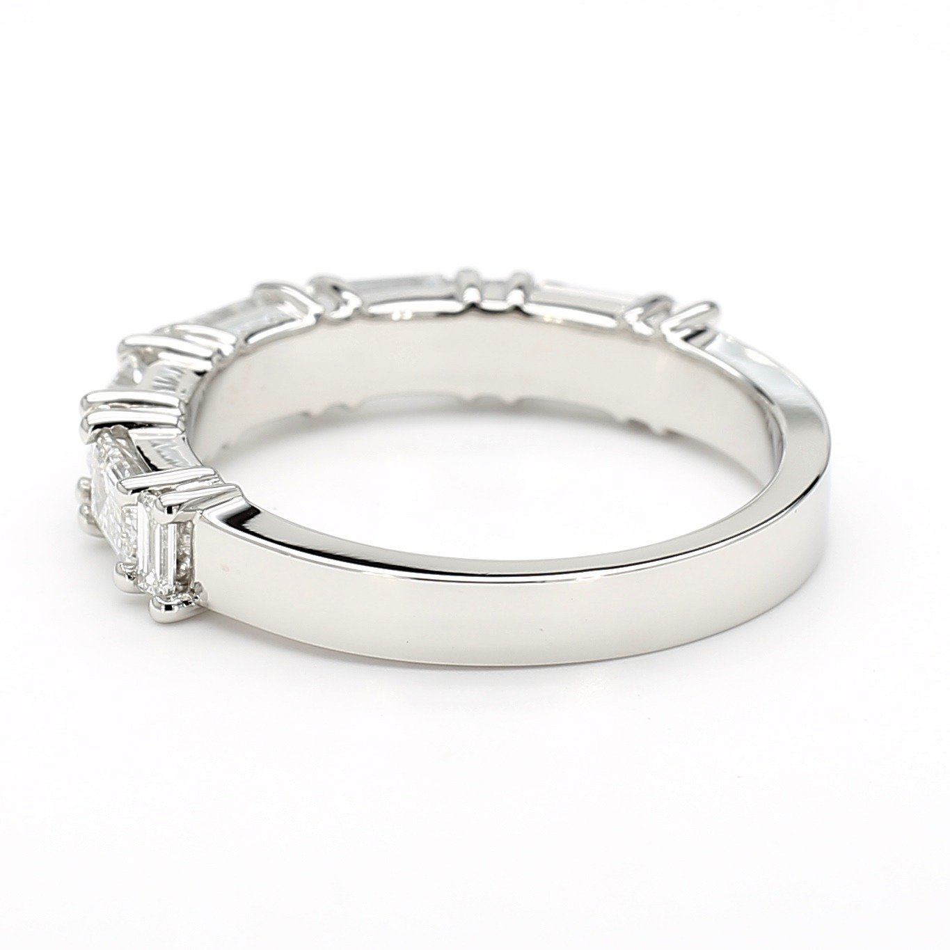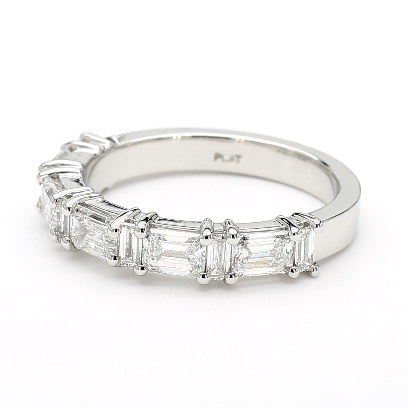 This wedding band is crafted in platinum and set with alternating emerald-cut and straight baguette-cut diamonds in a shared-prong setting. The emerald cuts provide bold step-cut facets, while the baguettes add sleek linear brilliance, creating a refined balance of symmetry and sparkle. The band has a smooth, high-polish finish for comfortable wear and a modern, structured aesthetic.