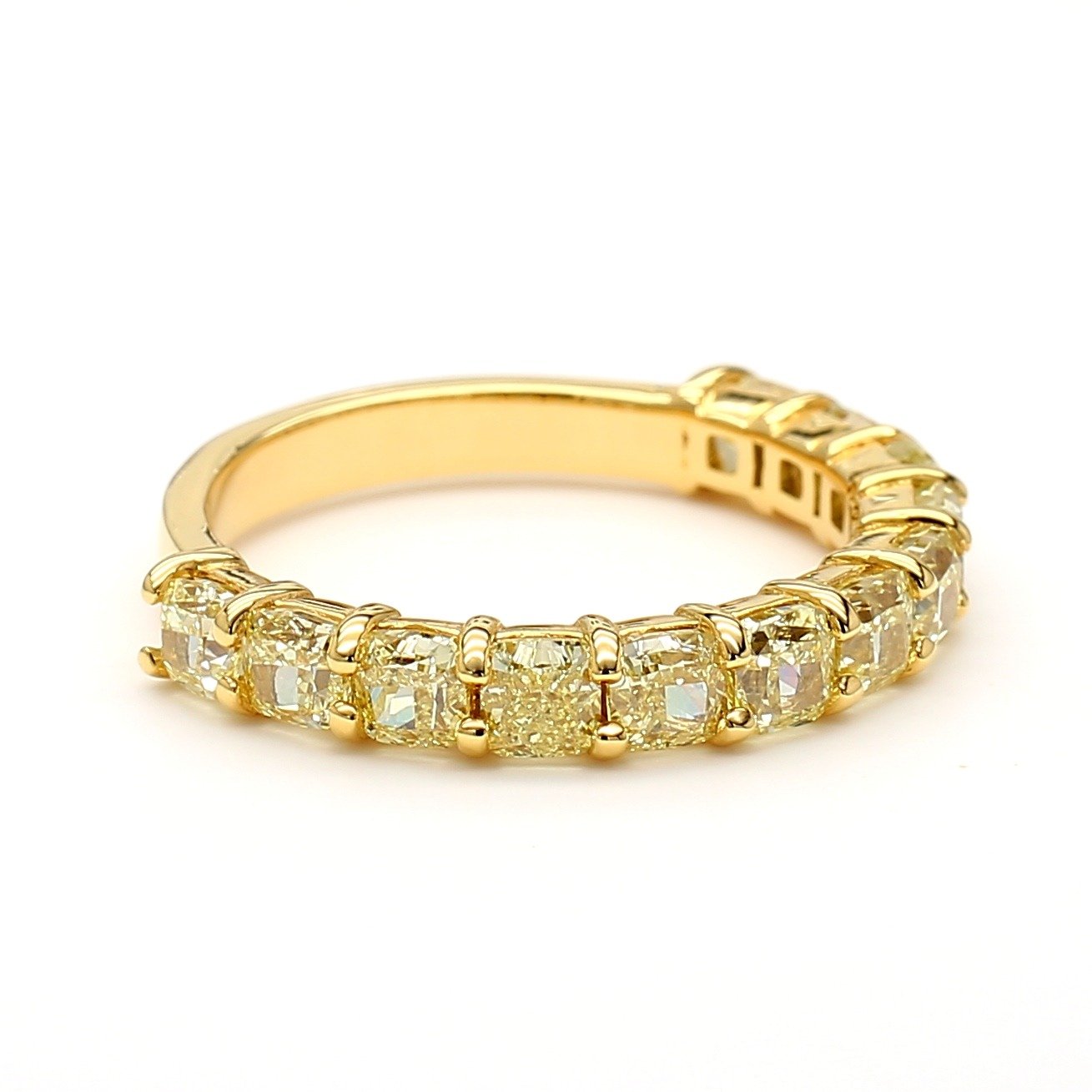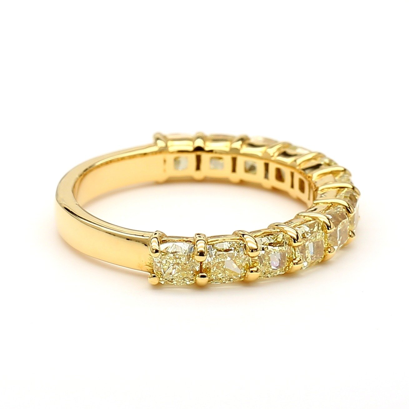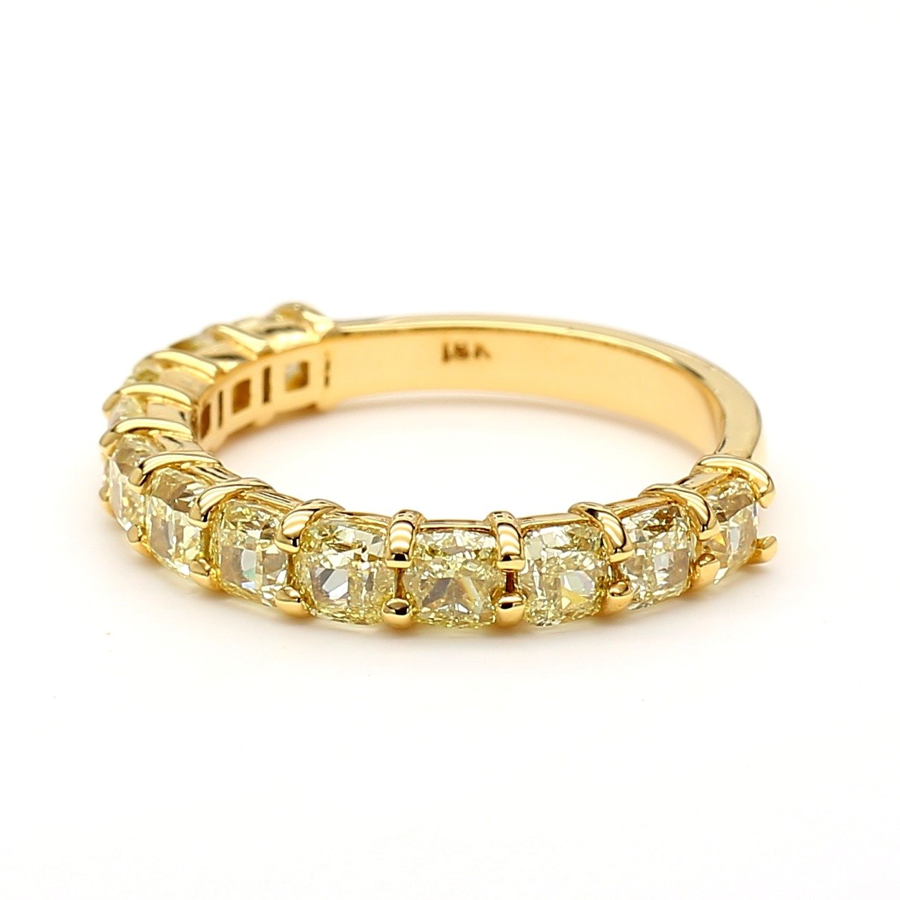 This exquisite half-way wedding band features a continuous row of dazzling fancy yellow cushion-cut diamonds, each meticulously set to showcase their vibrant hue and brilliant sparkle. The warm, golden tones of the diamonds create a striking and luxurious look, perfect for adding a touch of elegance and sophistication to any bridal set or as a standout piece on its own.