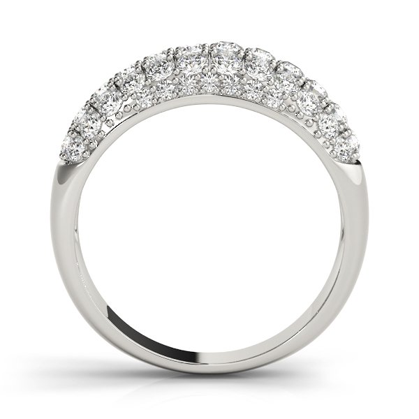 This wedding ring is made with graduated diamonds, set in micro-pave setting going 1/3 of the way. The design of the band has a slick dome look on the diamond area, and the bottom shank is plain-smooth.