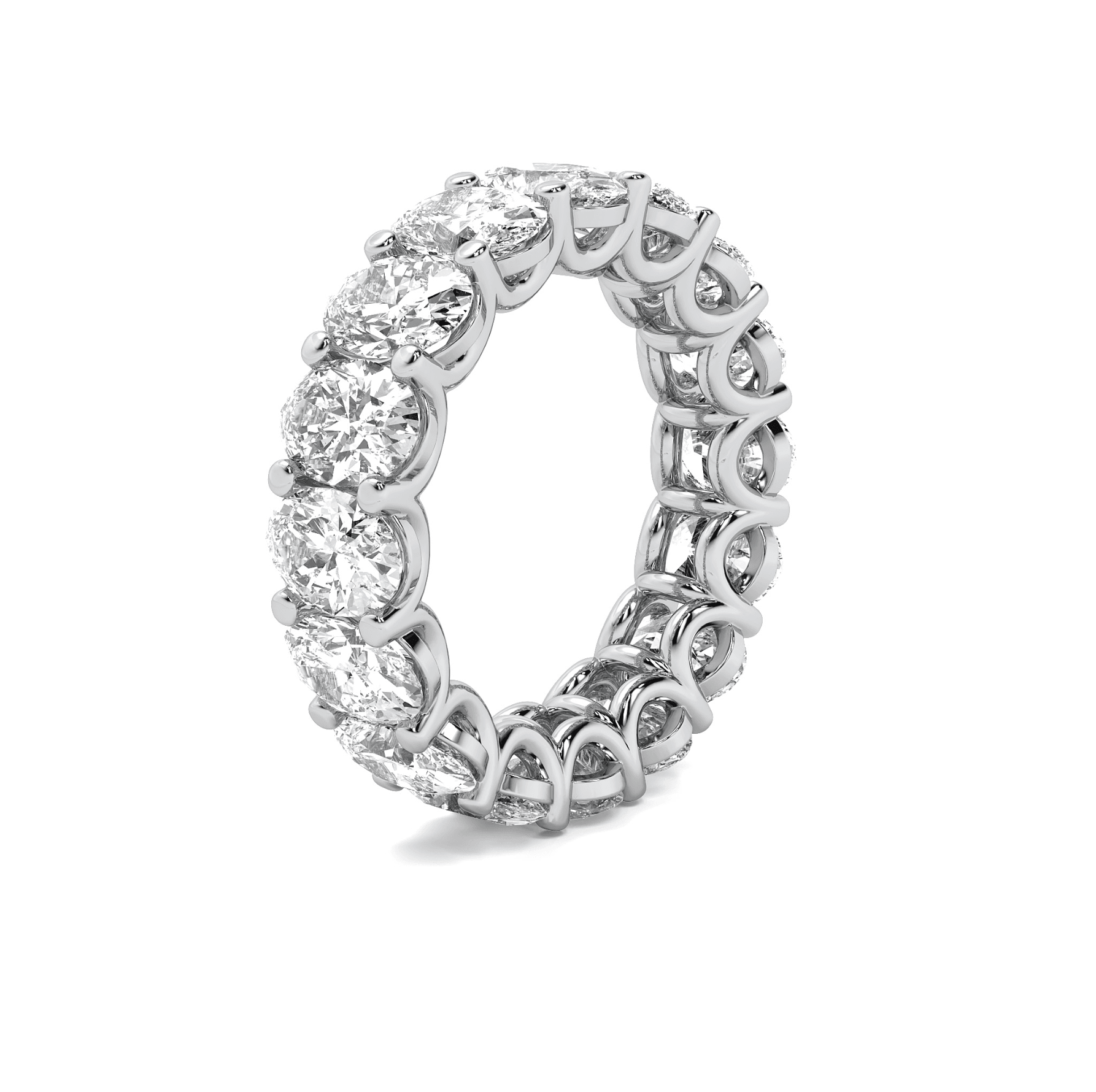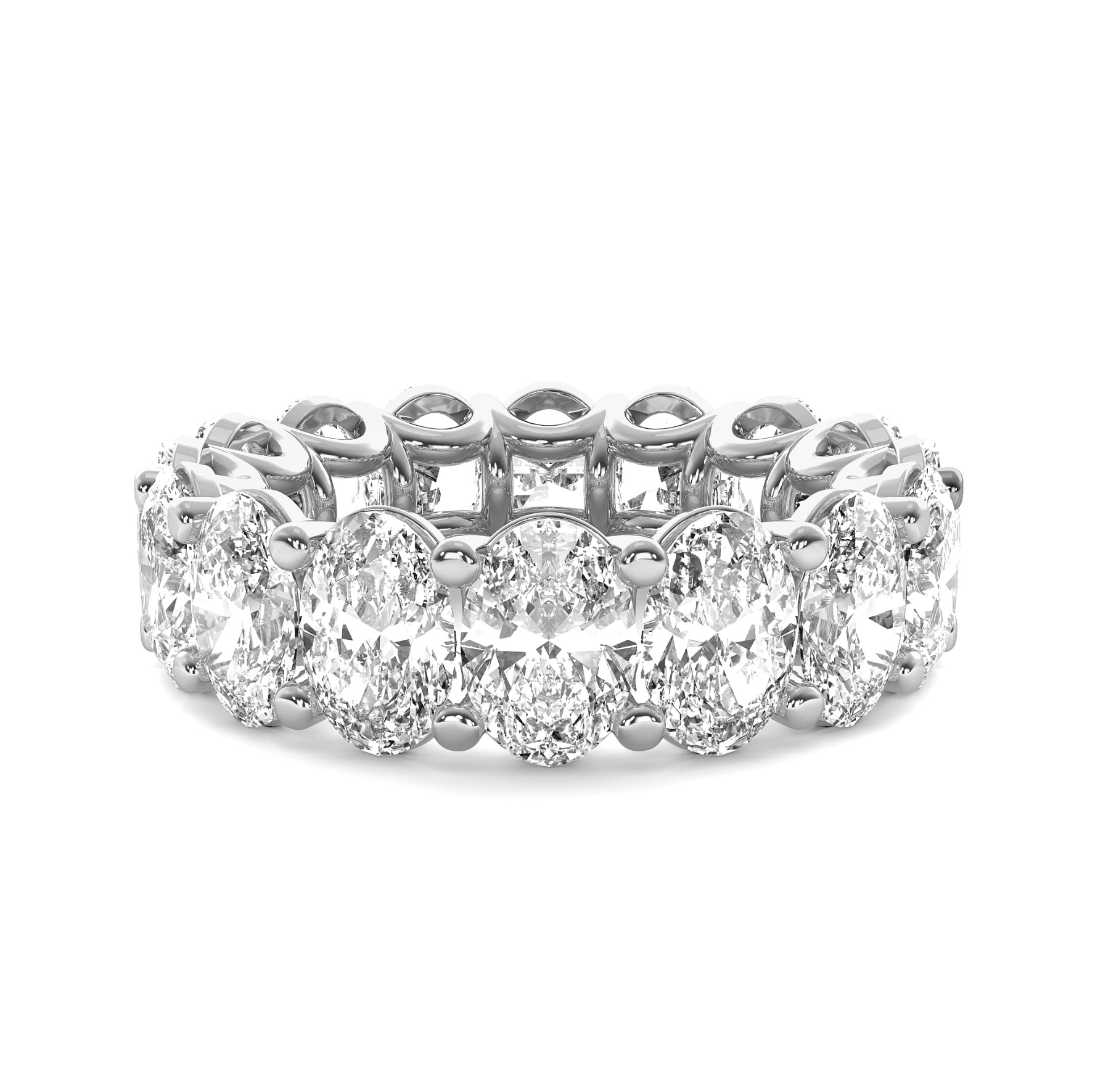 A breathtaking symbol of eternal love, this oval-cut diamond eternity band features a continuous row of brilliantly faceted oval diamonds, each set in a U-shaped setting that enhances their radiance and allows for maximum light exposure.