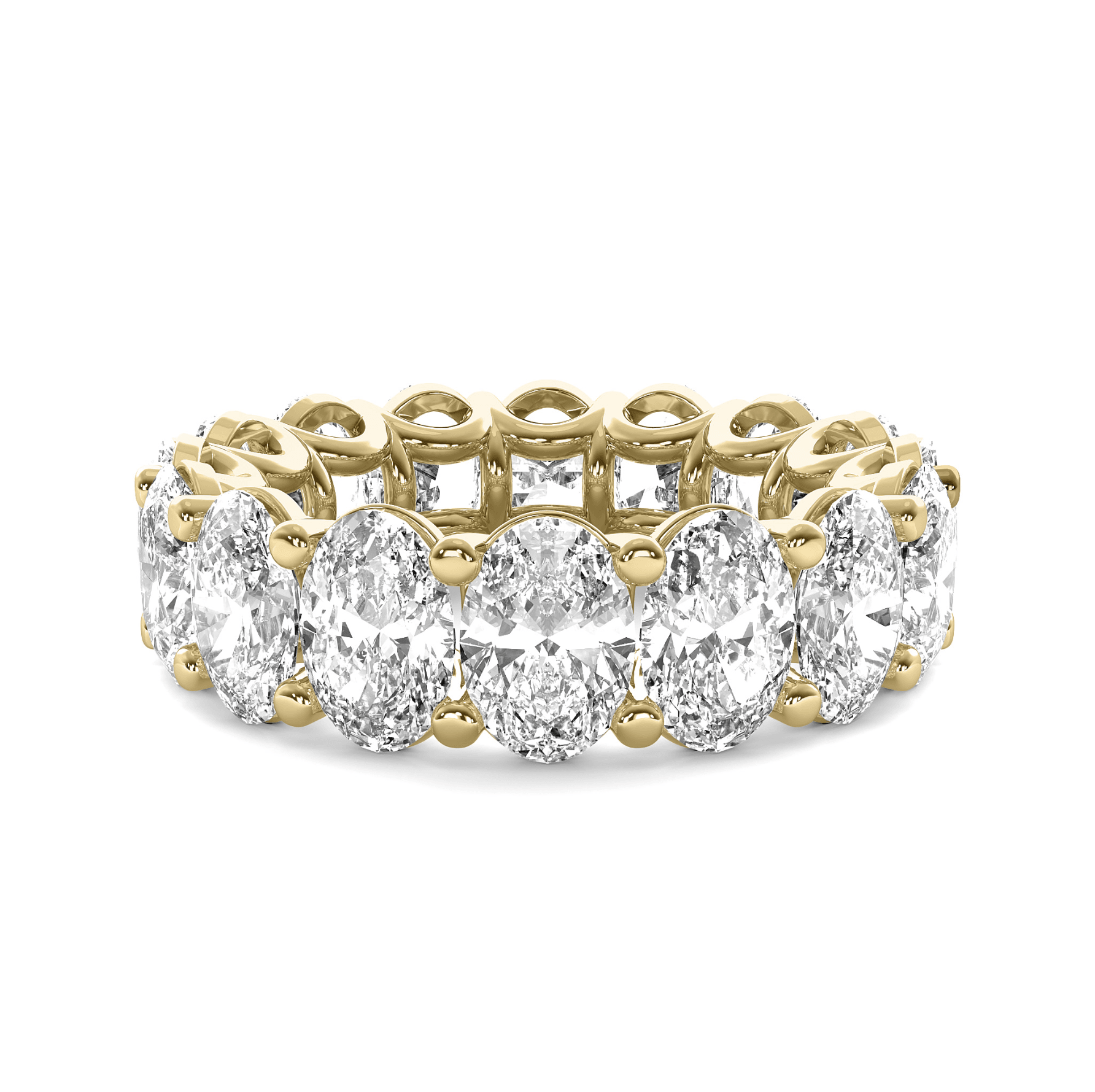 A breathtaking symbol of eternal love, this oval-cut diamond eternity band features a continuous row of brilliantly faceted oval diamonds, each set in a U-shaped setting that enhances their radiance and allows for maximum light exposure.