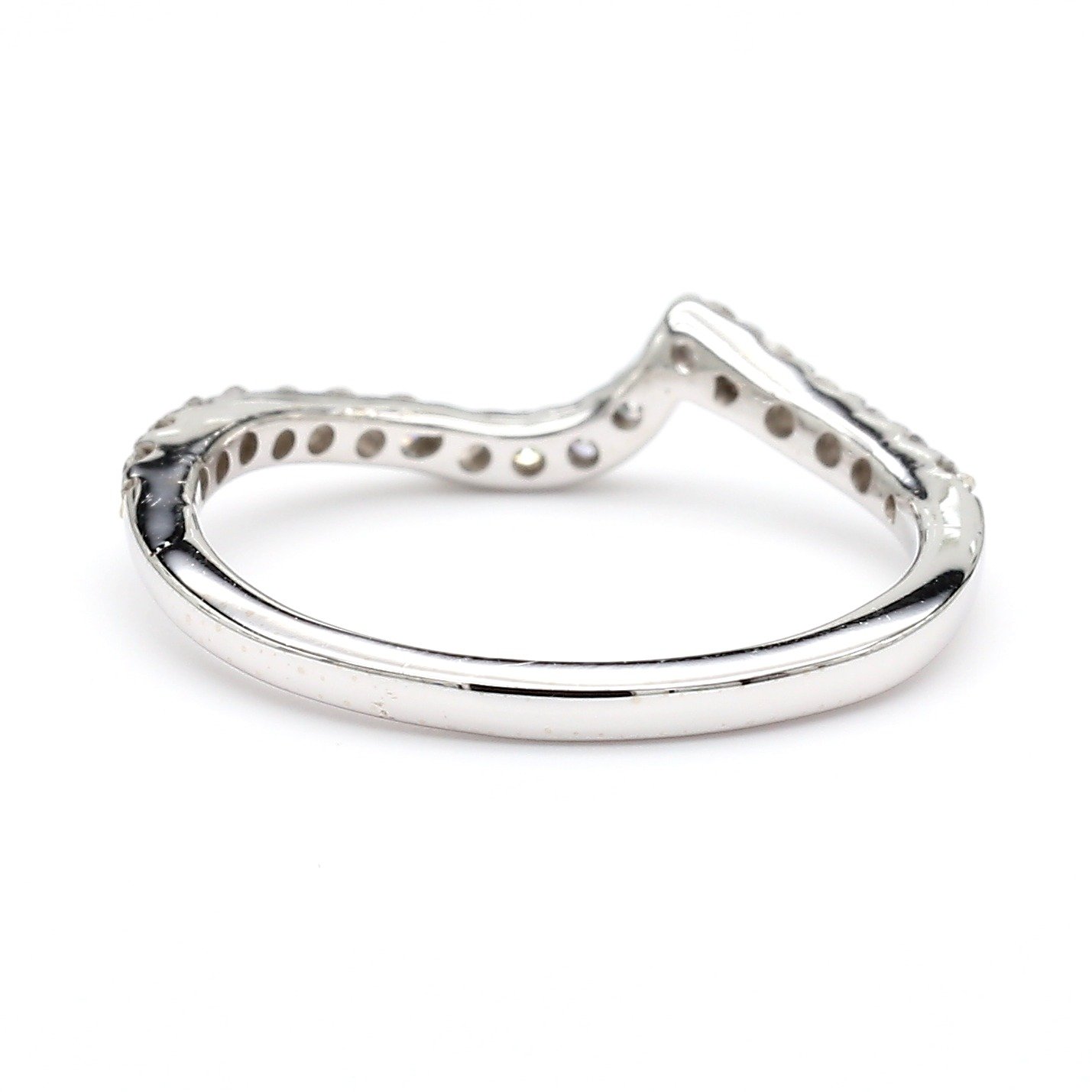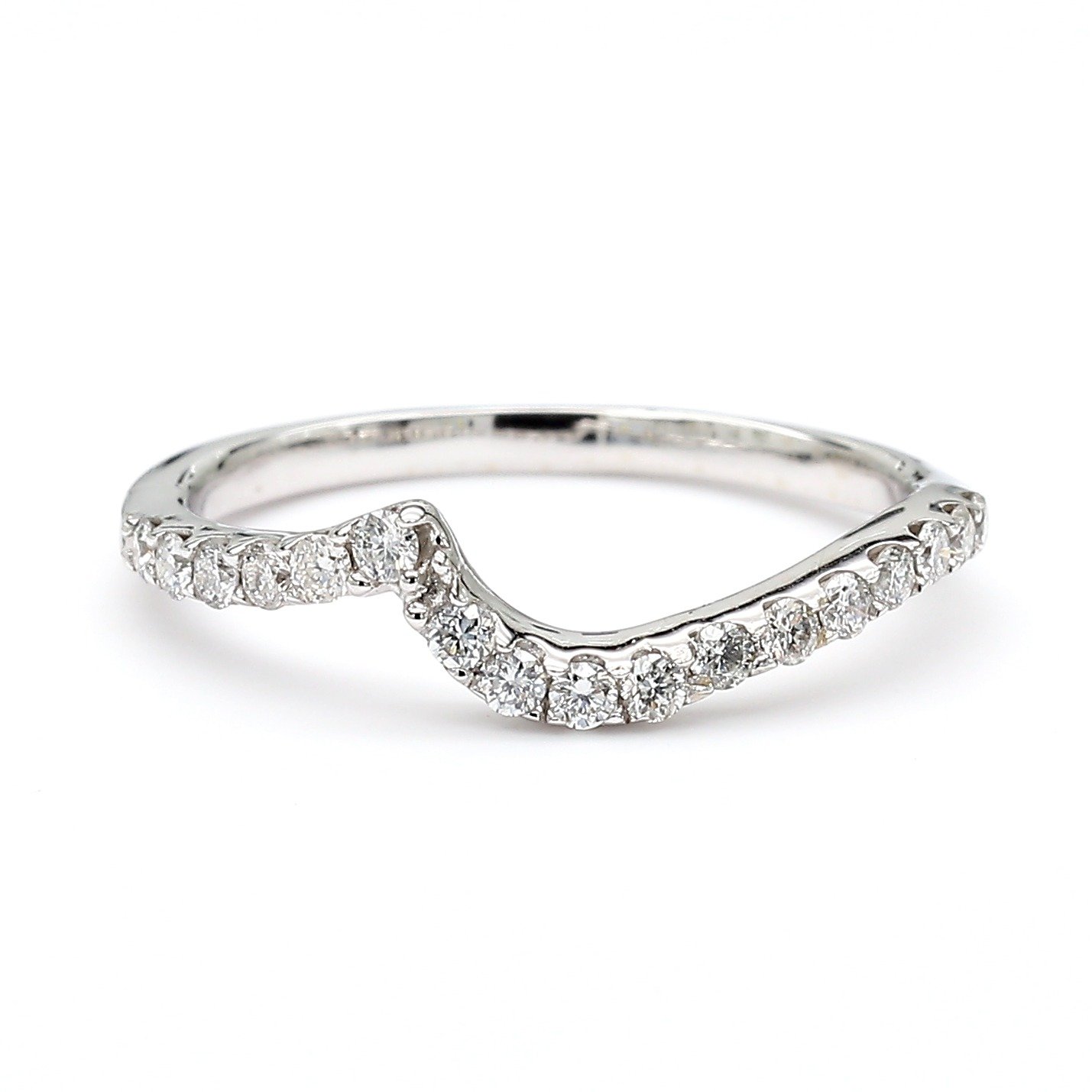 This is a beautifully crafted curved diamond wedding band, designed to complement an engagement ring or be worn alone as a delicate statement piece. The band is made of a high-quality precious metal, likely white gold or platinum, with a gentle contour that allows it to fit seamlessly around a solitaire or halo engagement ring. The band features a row of brilliant round-cut diamonds, elegantly set in a shared prong or pave setting, enhancing the ring's sparkle and sophistication. The graceful wave-like curve adds a touch of uniqueness, making it a perfect choice for those who appreciate both classic elegance and modern