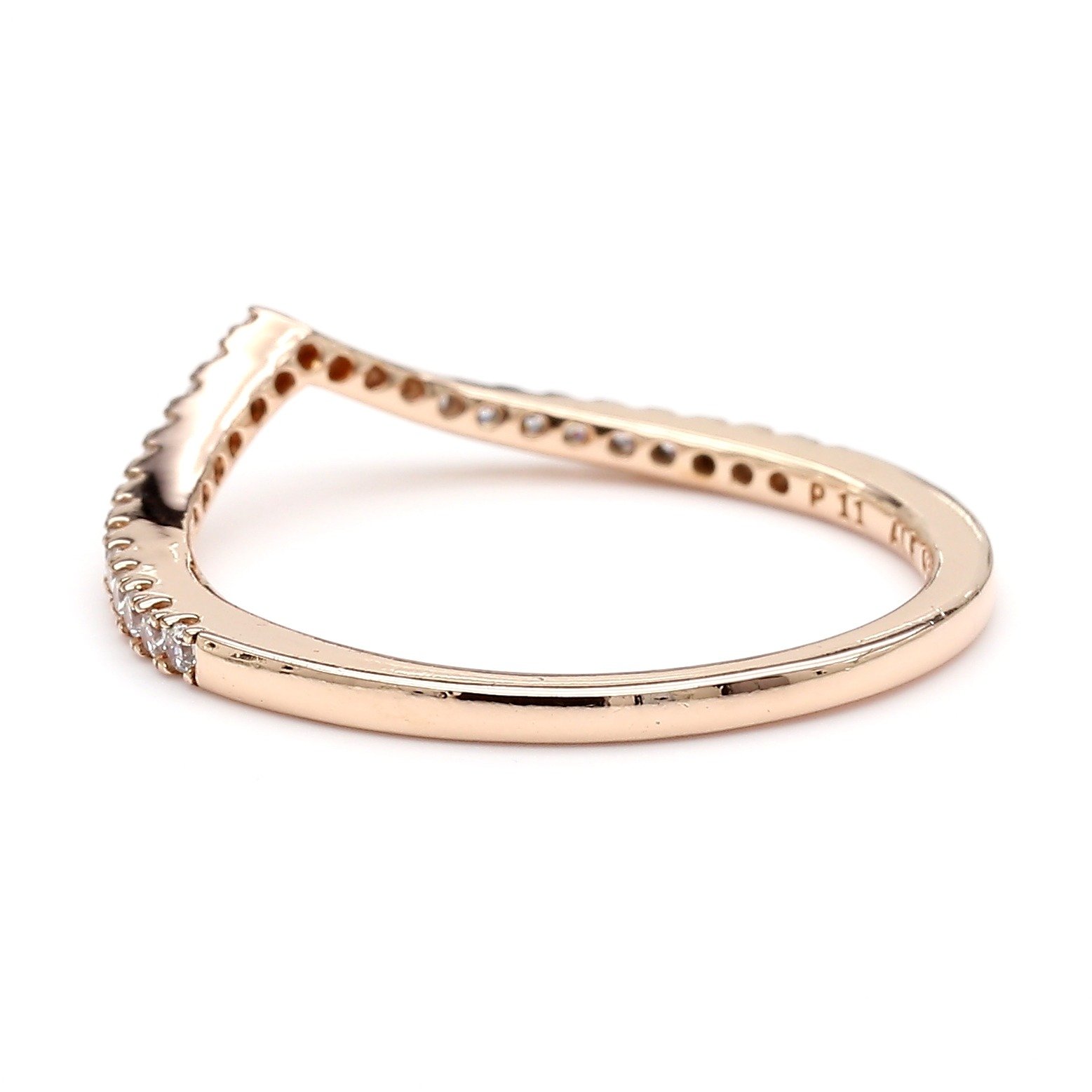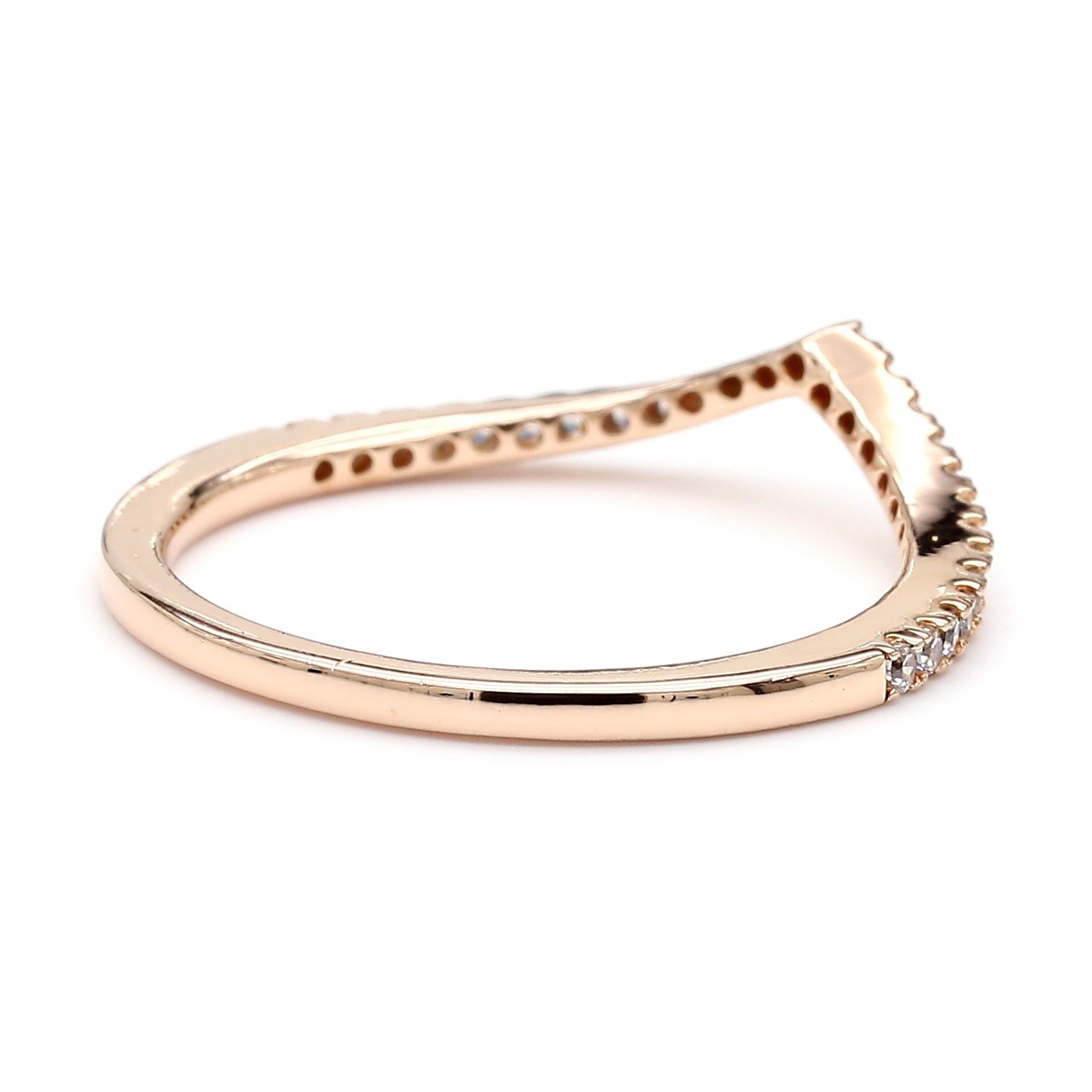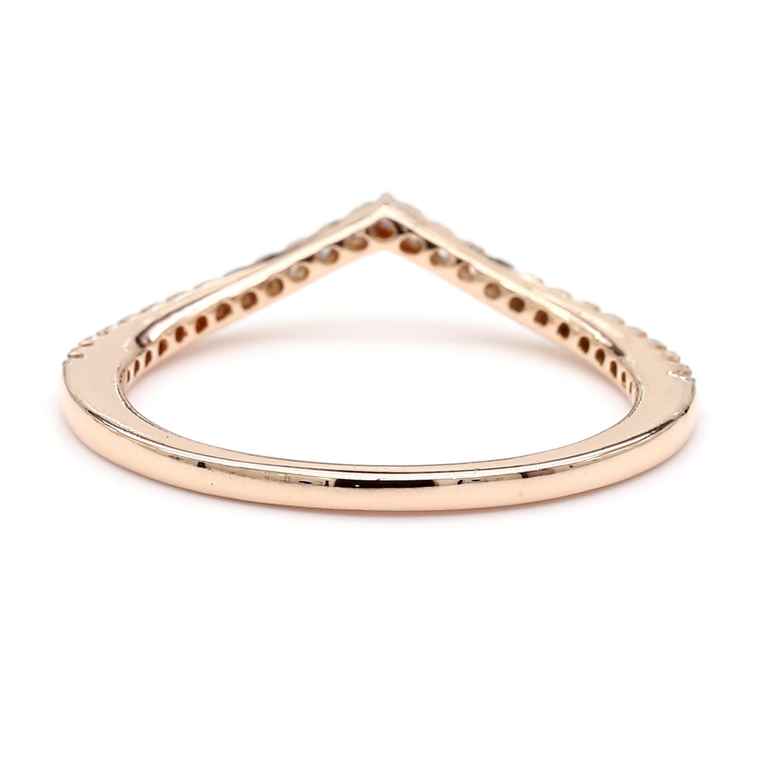 This stunning V-shaped Diamond Curve Band is a refined and elegant wedding band, perfect for stacking or wearing alone. Crafted in warm and romantic rose gold, the band features a sleek, symmetrical chevron design that beautifully complements engagement rings with solitaires or halos. A delicate row of brilliant round-cut diamonds is set in a classic pave setting along the curve, enhancing the band’s sparkle while maintaining a sophisticated and modern appeal. The V-shaped Diamond Curve Band symbolizes strength and harmony, making it an exquisite choice for a wedding or anniversary band with a timeless yet contemporary touch.