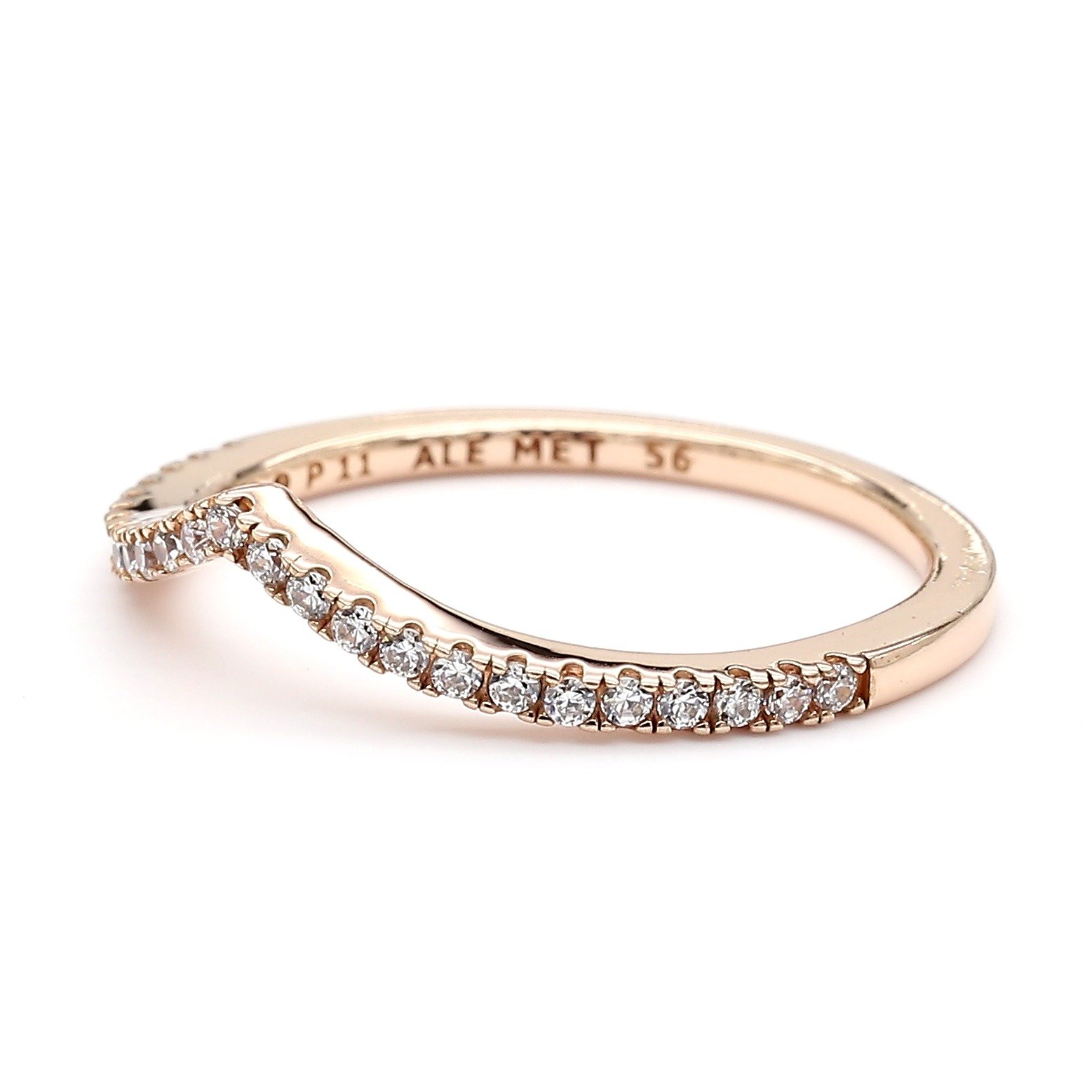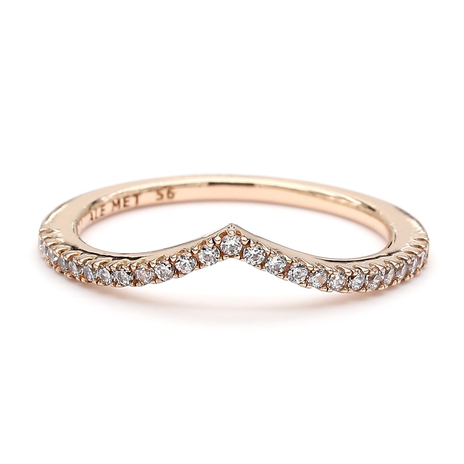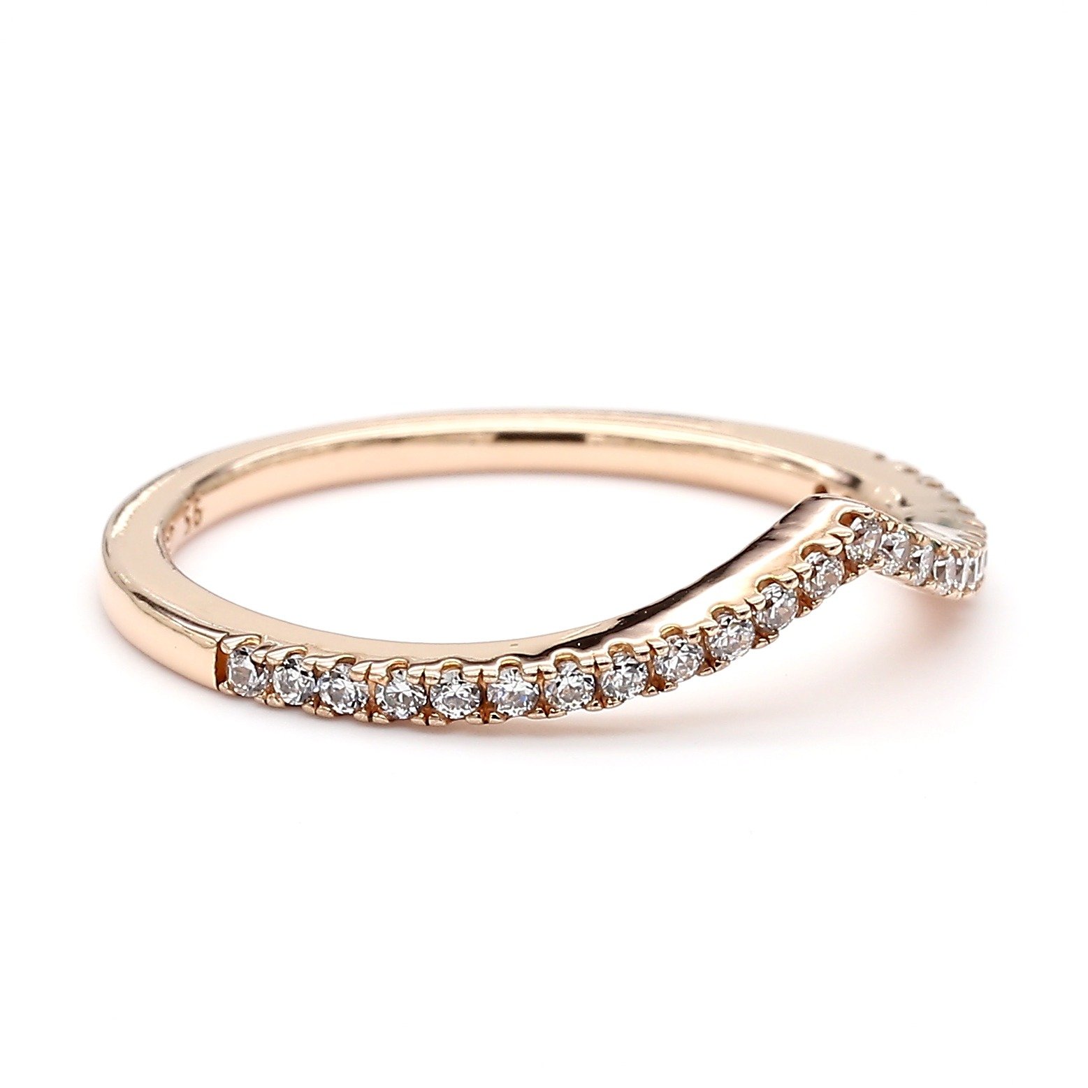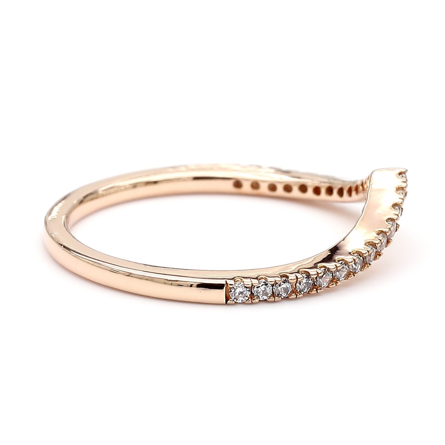 This stunning V-shaped Diamond Curve Band is a refined and elegant wedding band, perfect for stacking or wearing alone. Crafted in warm and romantic rose gold, the band features a sleek, symmetrical chevron design that beautifully complements engagement rings with solitaires or halos. A delicate row of brilliant round-cut diamonds is set in a classic pave setting along the curve, enhancing the band’s sparkle while maintaining a sophisticated and modern appeal. The V-shaped Diamond Curve Band symbolizes strength and harmony, making it an exquisite choice for a wedding or anniversary band with a timeless yet contemporary touch.