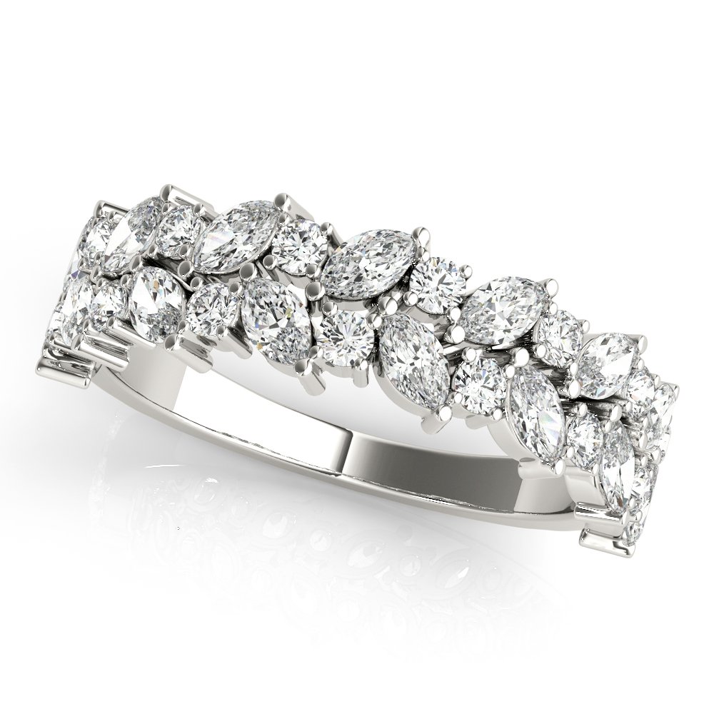 Introducing our Women's Fashion Two Row Diamond Wedding Band. This elegant band features two rows of sparkling diamonds, combining marquis and round shapes, blending modern sophistication with timeless beauty. Elevate your style with this exquisite accessory, perfect for symbolizing your enduring love and commitment. Available in your choice of Metal: Platinum, White Gold, Yellow Gold, and Rose Gold.